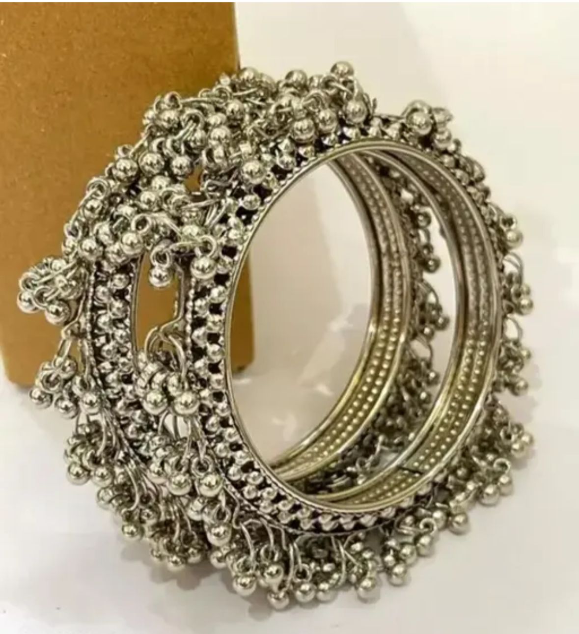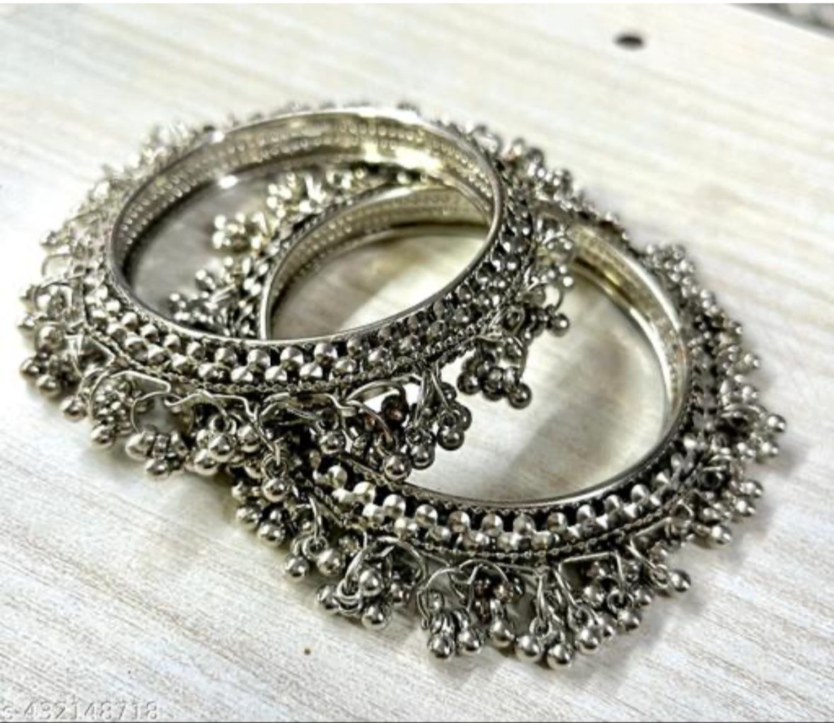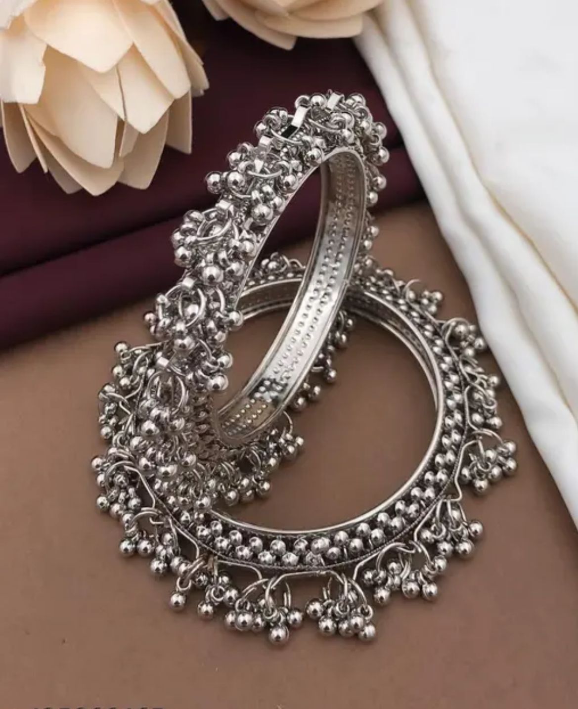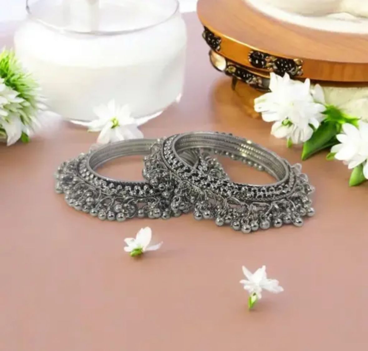 Add a touch of traditional elegance to your look with these antique oxidized silver bangles. Adorned with beautifully crafted clustered ghungroo detailing, these bangles create a soft, rhythmic jingle with every movement. Their intricate design blends heritage charm with everyday wearability, making them perfect for weddings, festive occasions, and cultural celebrations. A statement piece that effortlessly elevates any ethnic outfit.