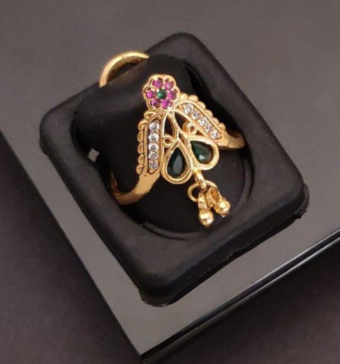 This unique ring features a beautiful butterfly-inspired design with a playful, dangling charm. Crafted with a polished gold-plated finish, it is adorned with a vibrant array of cubic zirconia stones in green, pink, and white. The intricate details and sparkling gems make this a perfect accessory for adding a touch of whimsy and elegance to any look.