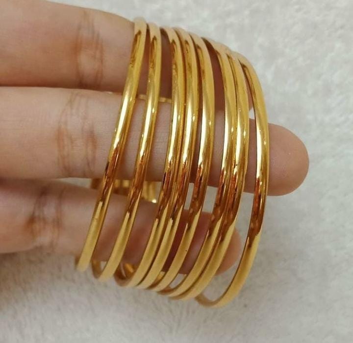 Your everyday stack, upgraded. These sleek, slender bangles feature a mirror‑shine gold polish and smooth rounded edges for easy, all‑day wear. Style them solo for minimal chic or stack them high for festive glam.