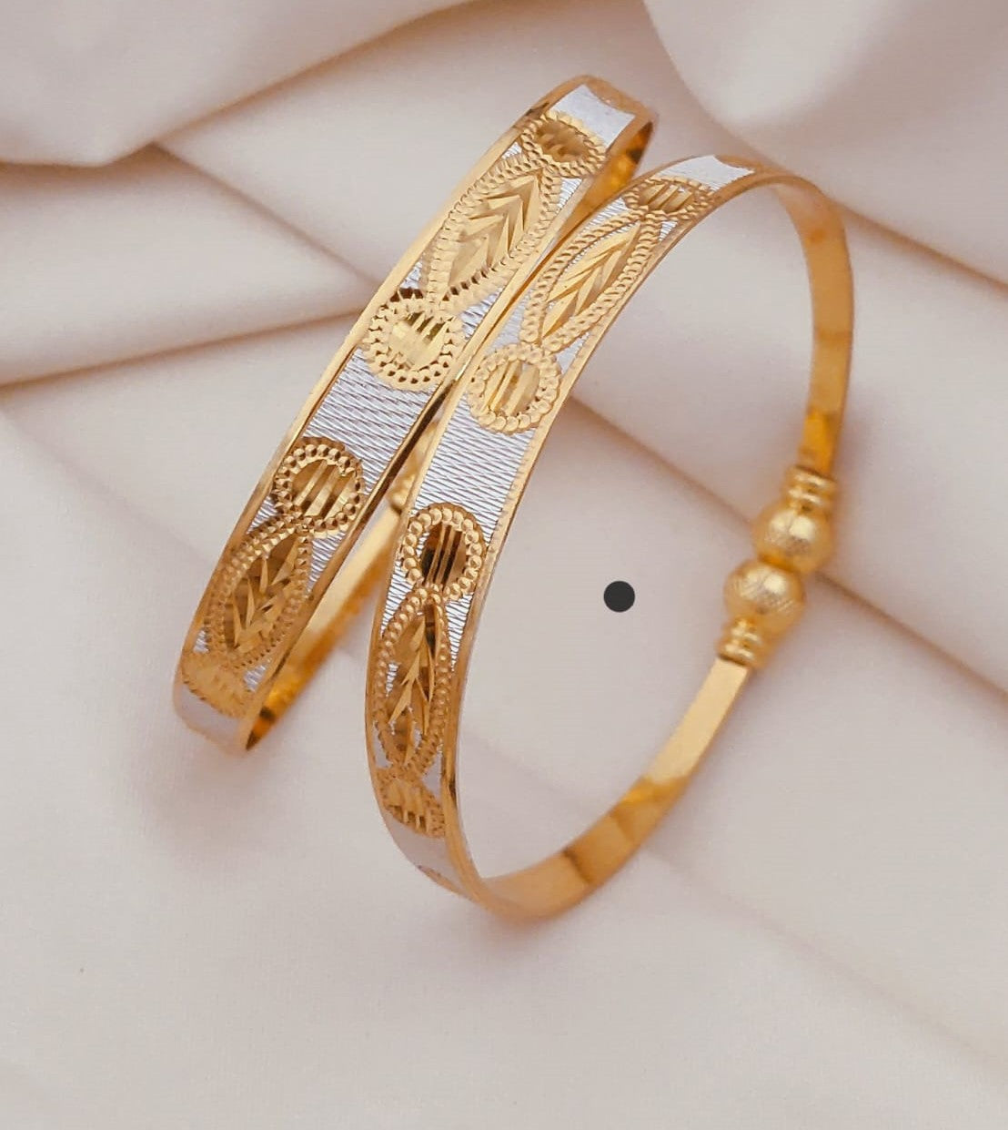 This delicate gold and silver patterned bangle set is designed to add a touch of elegance to your everyday look. Featuring intricately crafted patterns, the combination of gold and silver creates a stunning visual contrast, making these bangles perfect for any occasion. The lightweight, comfortable fit ensures all-day wear, while the detailed design brings a refined, timeless charm to your wrist. These bangles are a beautiful blend of tradition and modern style, ideal for enhancing your jewelry collection.