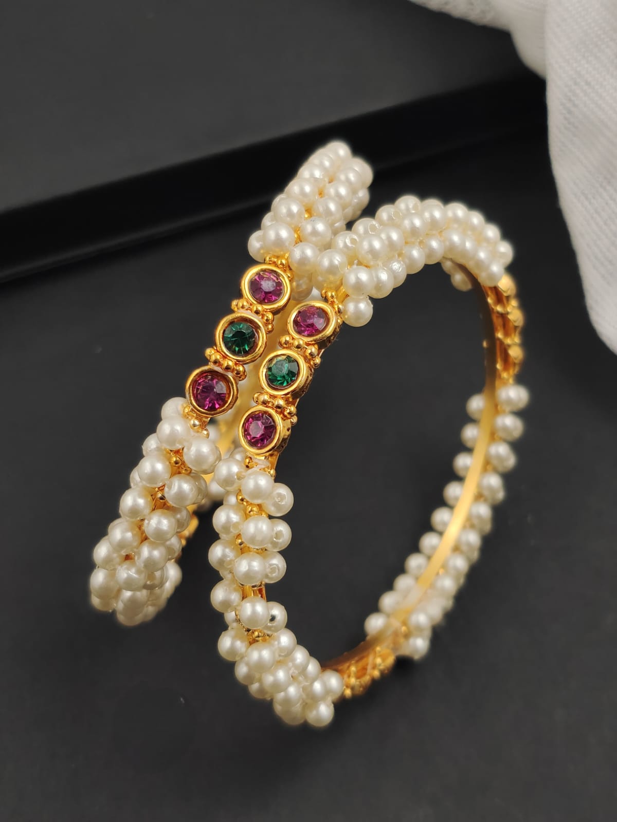Elegant with a pop of color, these bangles are wrapped in two rows of glossy ivory pearls and finished with a front panel of bezel‑set green and pink stones. Lightweight and photo‑ready, they’re perfect for weddings, mehendi, and festive fits—or stacking with your favorites.