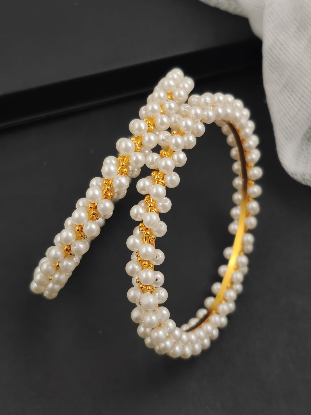 Timeless and luminous, these bangles are wrapped in twin rows of ivory pearl beads on a sleek gold‑tone base. Lightweight and stackable, they add instant elegance to ethnic fits and everyday looks alike.