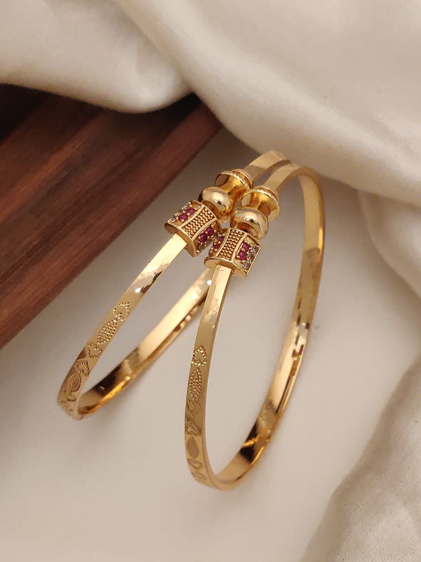 This elegant gold bangle set features intricate detailing with beautiful ruby and diamond-like stone accents. The delicate design is complemented by finely etched patterns, while the vibrant rubies add a pop of color. These bangles are perfect for both everyday wear and special occasions, adding a touch of sophistication and charm to any outfit. The high-quality craftsmanship ensures lasting beauty, making this set an essential addition to any jewelry collection.