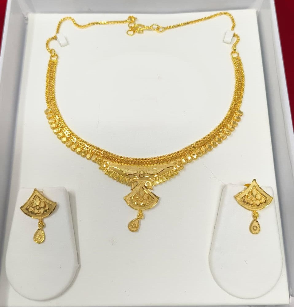 Timeless and elegant, this collar‑style necklace shimmers with intricate engraving and a coin‑edge border. A fan‑shaped center pendant with a teardrop charm adds graceful movement, while matching drop earrings mirror the motif. Perfect with saris, lehengas, and dressy kurtas.