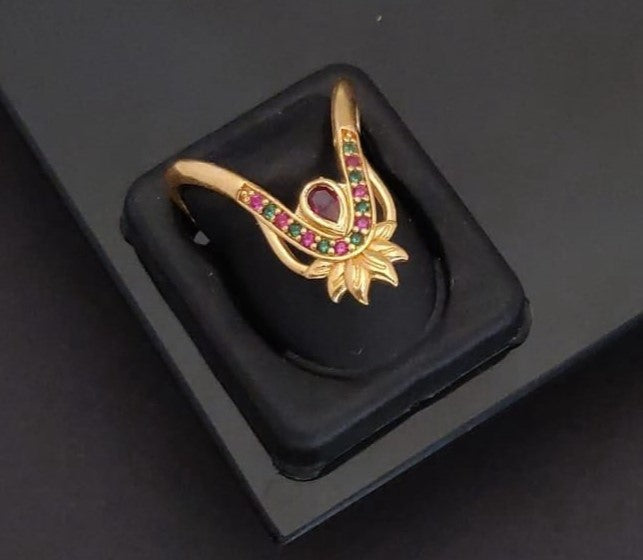 This striking gold-plated ring features a unique design with a beautiful lotus blossom at its base, symbolizing purity and beauty. The elegant V-shaped band is adorned with a vibrant array of red and green cubic zirconia stones, leading up to a single, deep red teardrop gem at the center. This piece is a perfect blend of modern style and traditional inspiration, making it an excellent choice for adding a touch of sophisticated charm to any outfit.