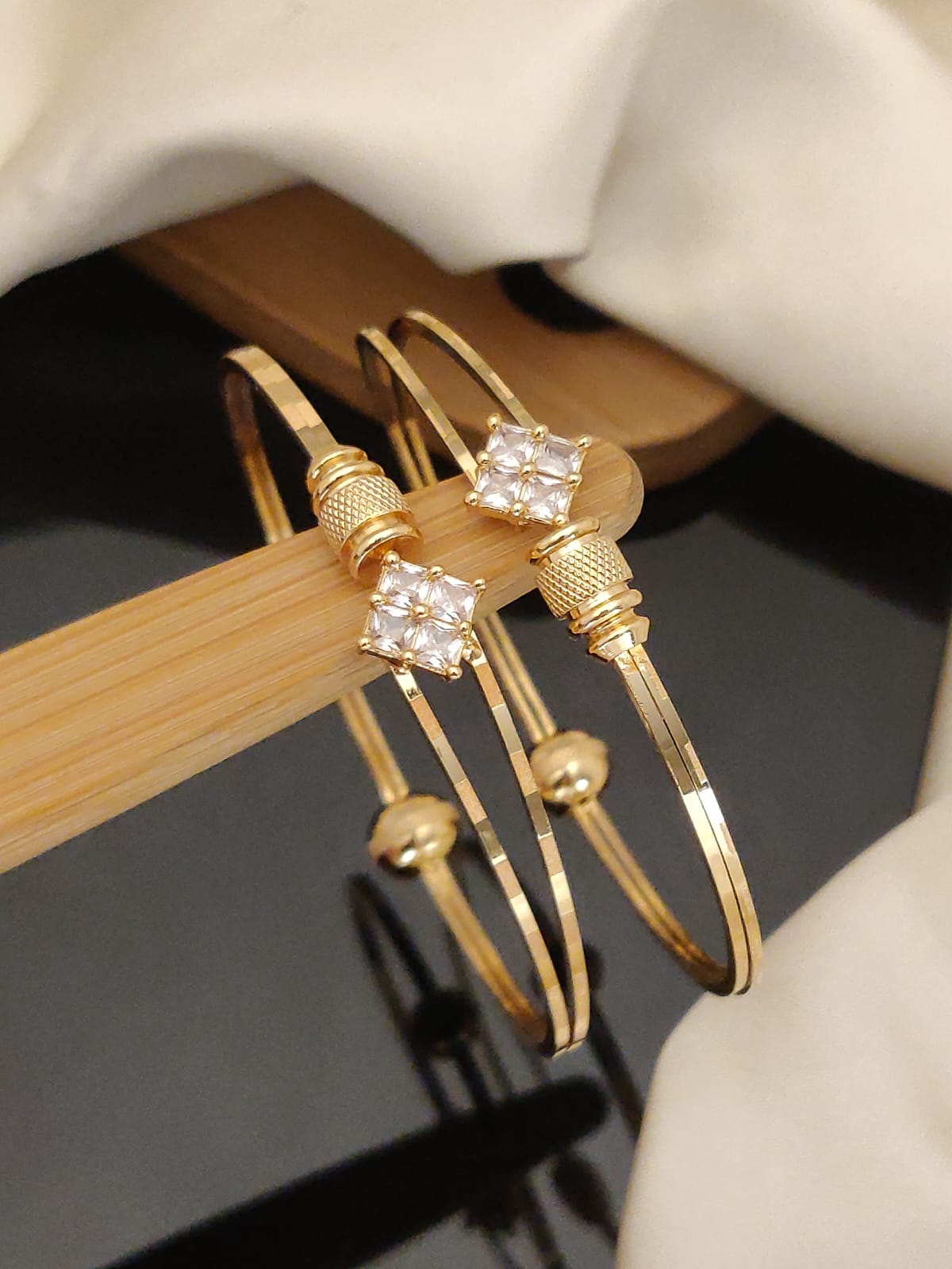 Sleek and elegant, this minimalist gold bangle set features charming diamond-like stone accents, perfect for adding subtle sparkle to any look. The delicate design, with smooth curves and refined detailing, ensures a comfortable and stylish fit. Whether for casual wear or special occasions, these bangles are a timeless addition to your jewelry collection, offering a blend of modern simplicity and understated glamour.
