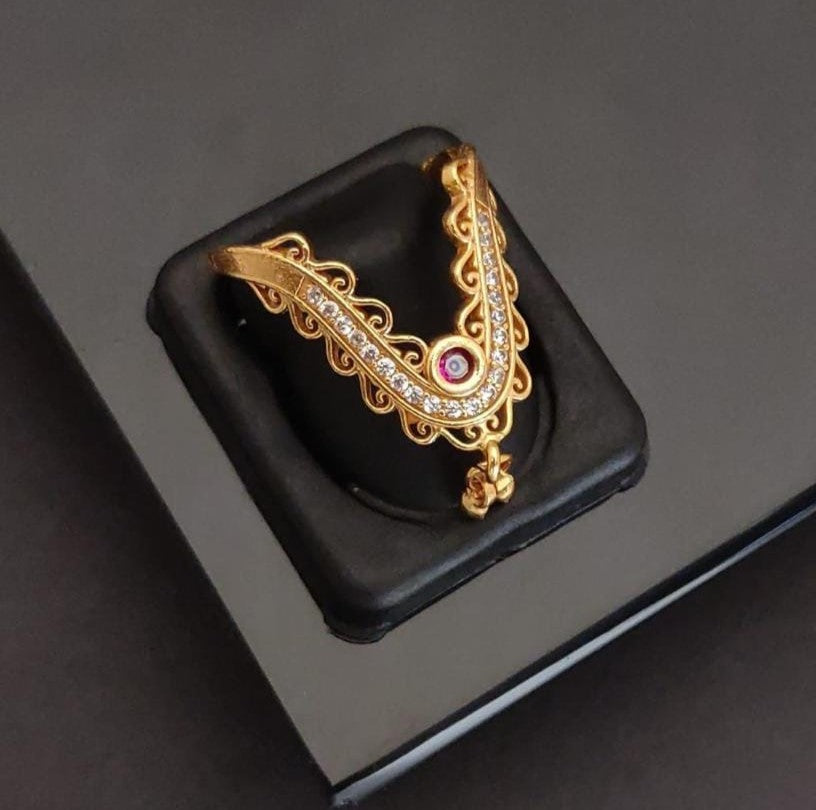 This exquisite gold-plated ring features an intricate and elegant V-shaped design that's sure to turn heads. The flowing, ornamental frame is set with a brilliant line of clear cubic zirconia stones, creating a stunning sparkle. A single, rich red gemstone at the center adds a pop of color, while a delicate dangle charm below sways with every movement. This ring perfectly blends classic charm with a touch of modern flair, making it an ideal piece for both special occasions and adding sophistication to your everyday style.