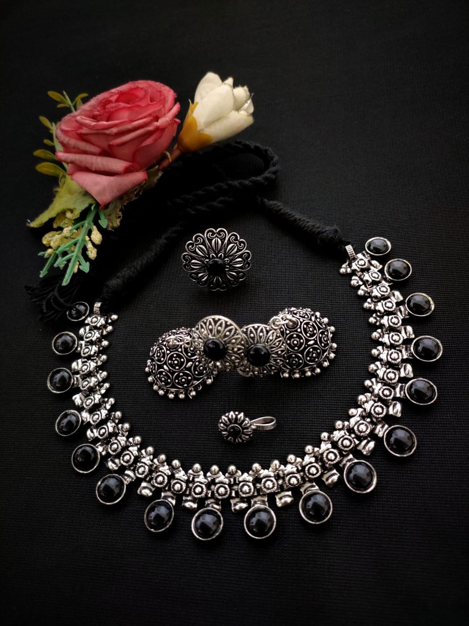 Oxidised Afghani Choker Set (German Silver) – Necklace, Earrings, Ring & Nose Pin