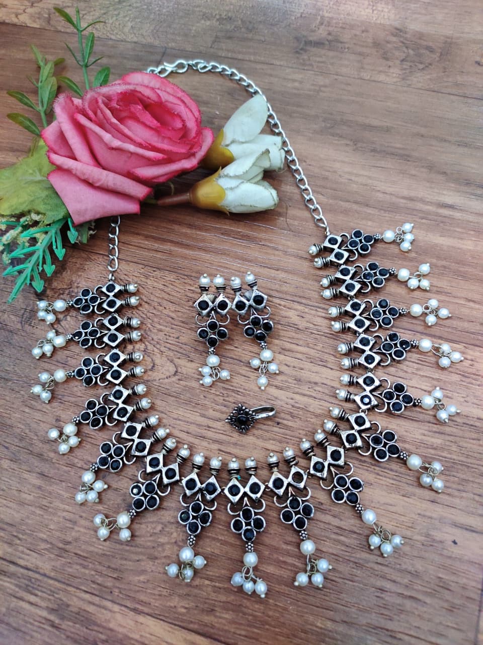 A statement collar necklace in oxidised German‑silver finish, studded with glossy black stones and finished with playful ivory‑pearl bunches. The matching dangler earrings and clip‑on nose pin complete the festive, boho look—perfect with sarees, kurtas, lehengas, or Indo‑western outfits.