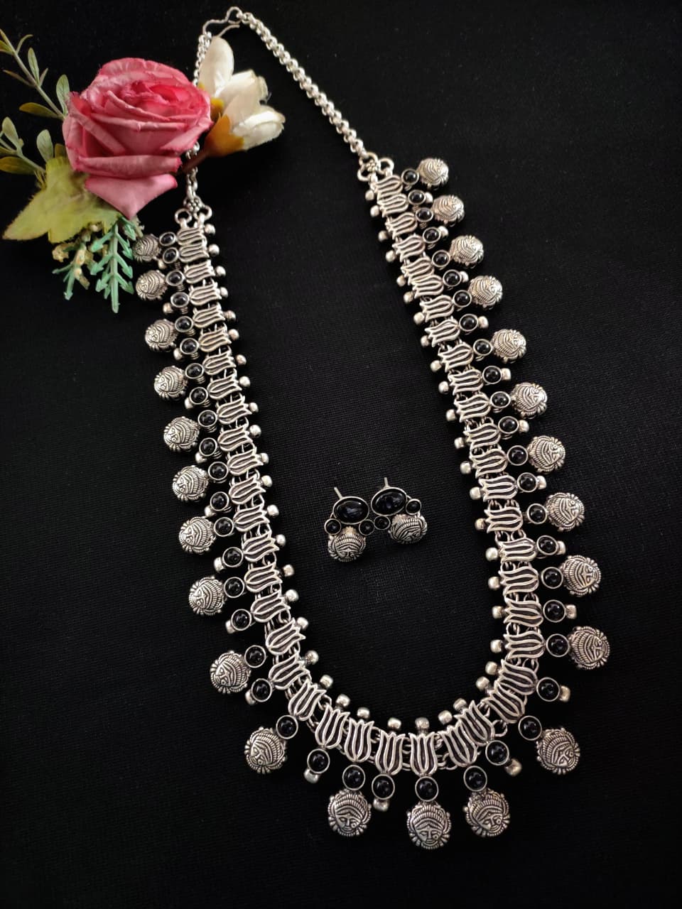 Old‑world charm in classic black. This statement necklace features an antique silver‑tone finish lined with jet‑black stones and embellished with carved coin charms and bead details. Paired with coordinating studs, it elevates saris, kurtas, and Indo‑western fits for festivals or everyday glam.