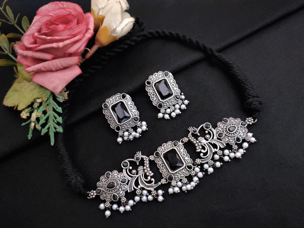 Oxidized Peacock Black Stone Choker Set – Silver‑Tone with Pearl Drops