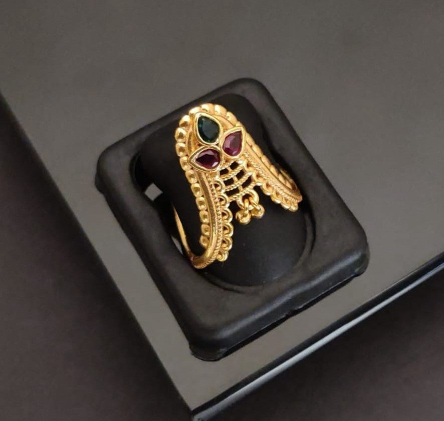 This stunning gold-plated ring is designed to make a statement with its intricate craftsmanship and classic elegance. The ornate, fan-shaped design features bold red and green gemstones, framed by delicate rope detailing and shimmering ball accents. This piece beautifully merges traditional artistry with a modern silhouette, making it the perfect accessory for both special occasions and adding a touch of sophisticated flair to your daily style.