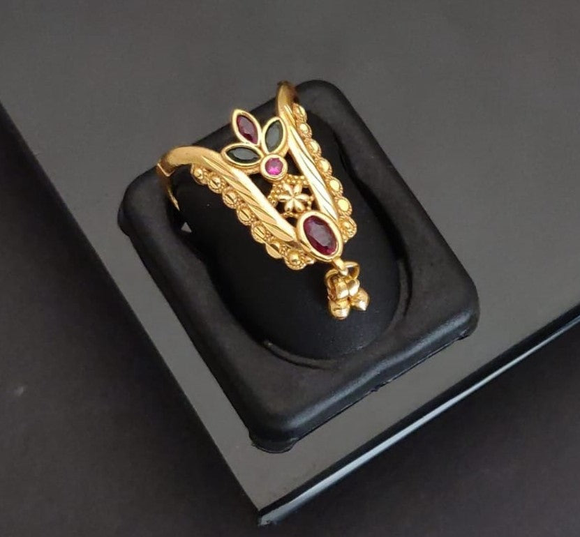This beautiful gold-plated ring features an exquisite V-shaped design that evokes classic elegance. Adorned with a striking combination of red and black cubic zirconia stones, the intricate leaf and floral motifs create a sophisticated, timeless look. A delicate dangle charm at the bottom adds a touch of graceful movement, making this ring a perfect blend of vintage charm and modern flair.